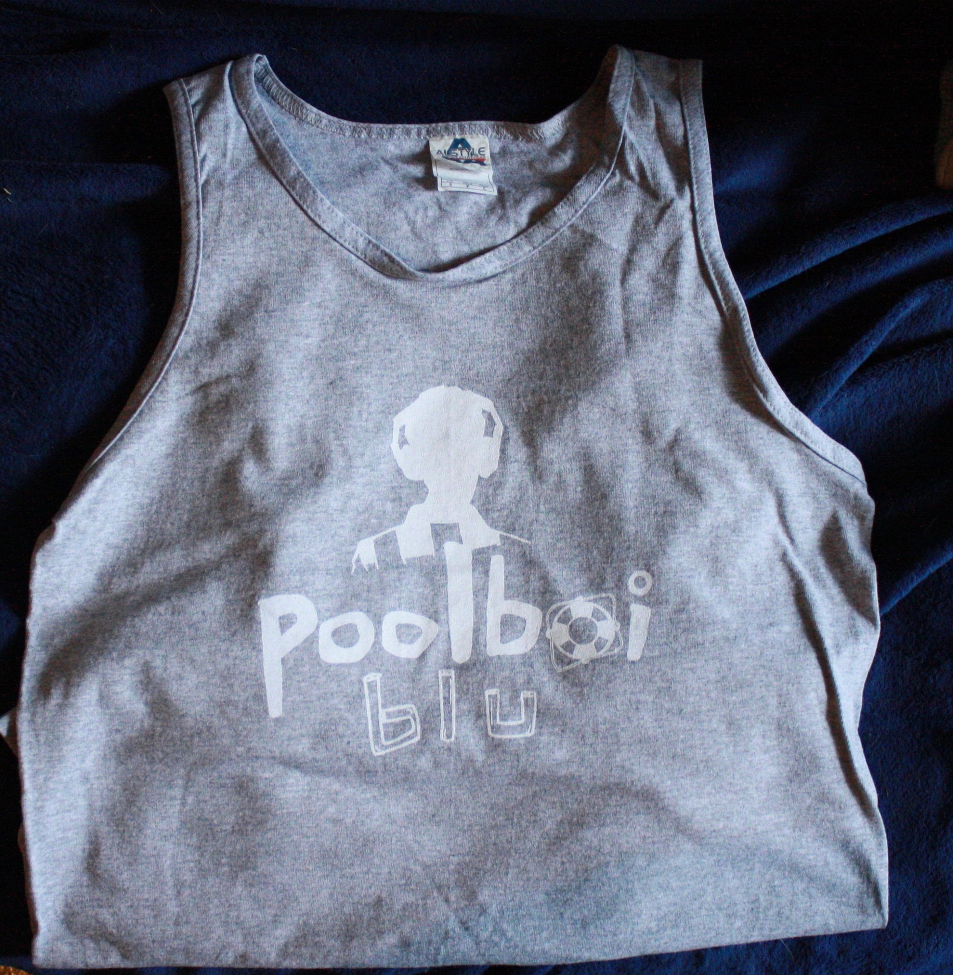 Grey tank top with blu or white OG poolboi logo. Last run in this color & cut.